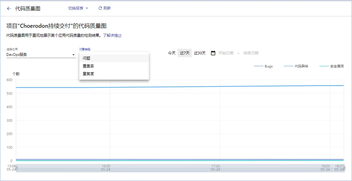 - DevOps报表中新增代码质量图,支持查看应用代码质量中Bug、安全漏洞、代码异味、重复度与单测覆盖率的变化详情。