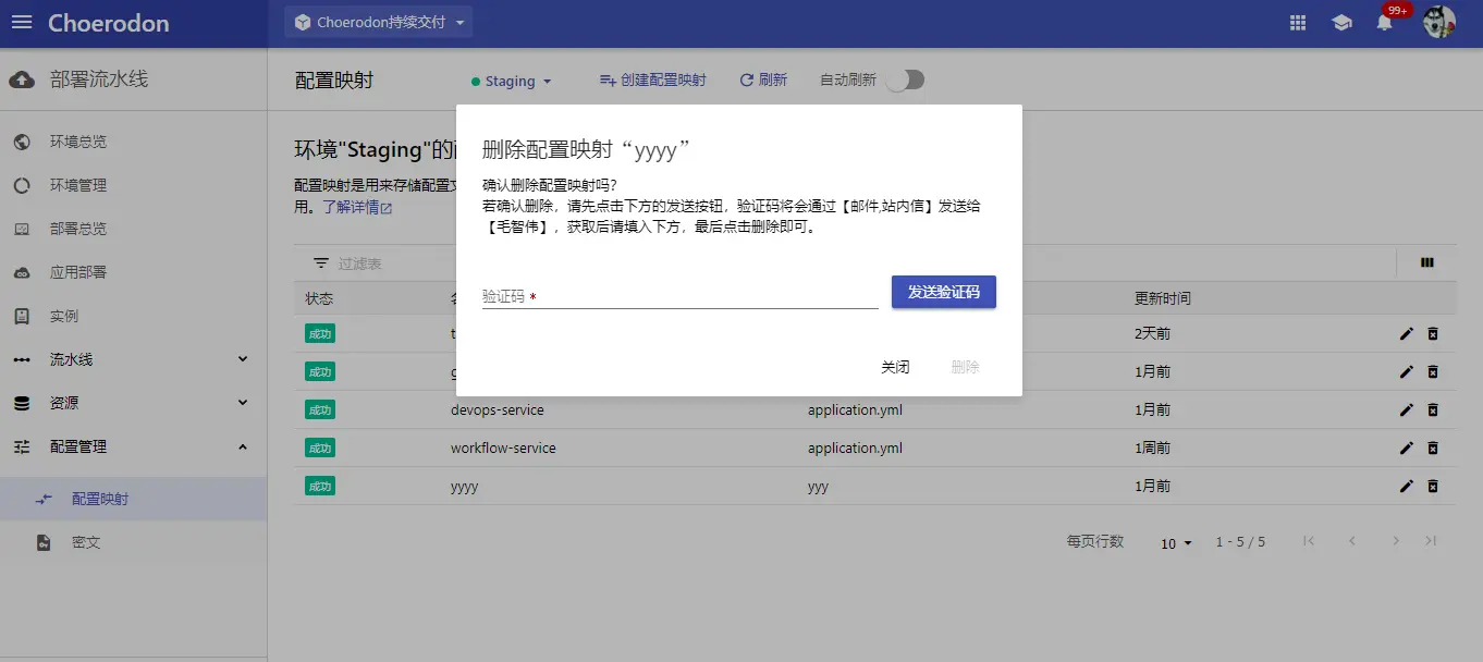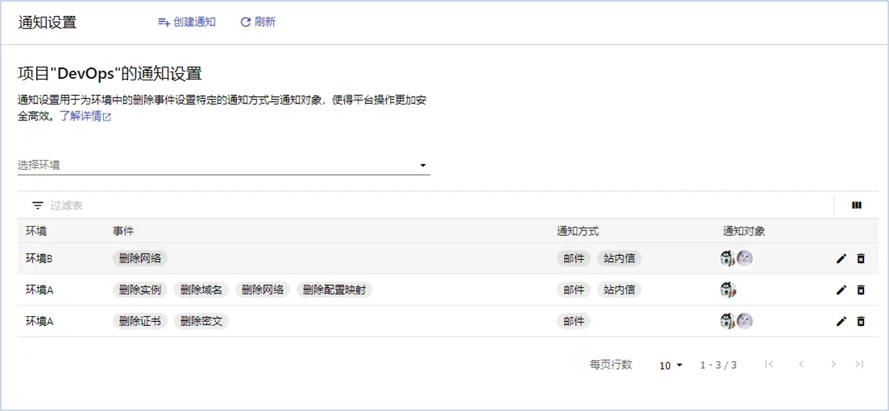 - 项目设置模块新增通知设置的功能,支持为各个环境下的删除事件配置通知方式(邮件、站内信或短信)与通知对象。