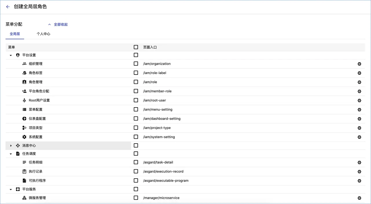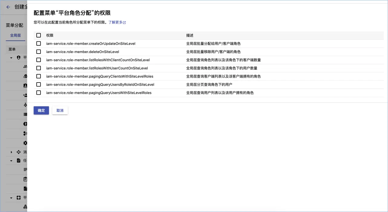 - 新增创建角色选择权限界面,权限返回信息以菜单分组。