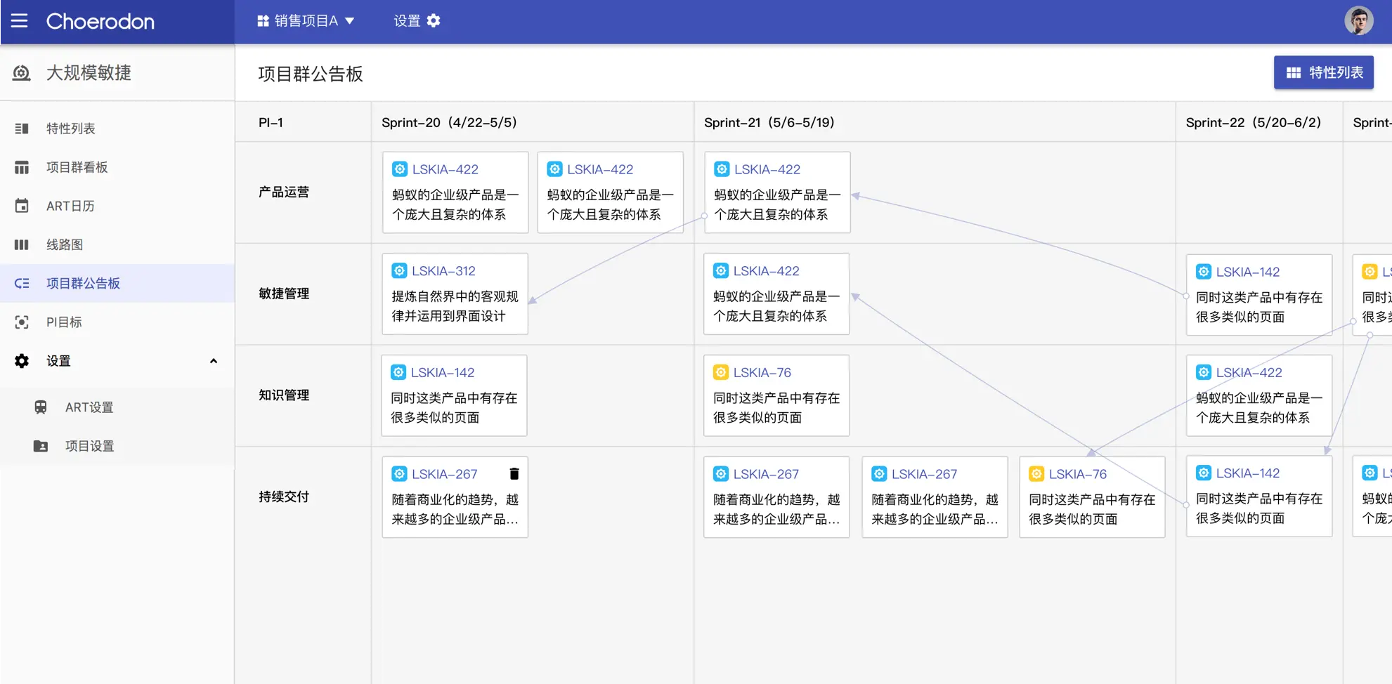 - 项目群成员可以通过公告板查看各个团队以及迭代之间的依赖关系。-