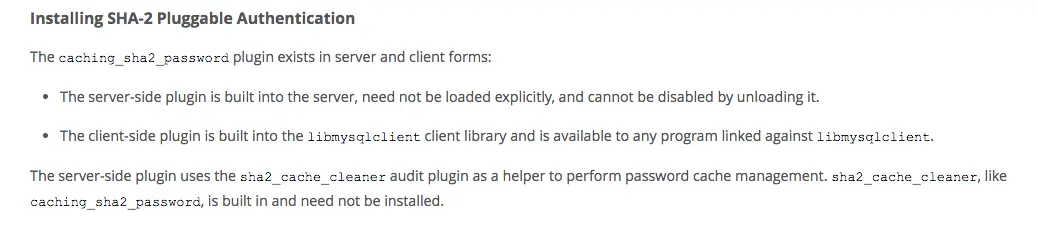 果然 root 的密码是用 caching_sha2_password 插件加密的。而客户端找不到 caching_sha2_password 插件,于是登录不上。我第一反应是给客户端安装相应插件,然而看了官文档: