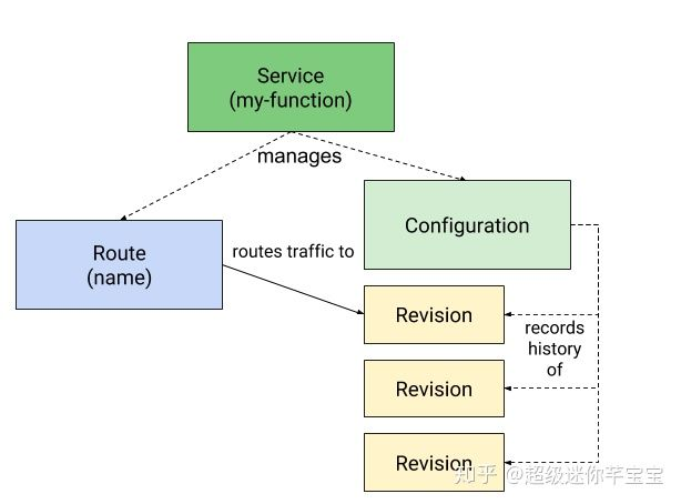 - Service: 自动管理工作负载整个生命周期。负责创建 Route、Configuration 以及 Revision 资源。通过 Service 可以指定路由流量使用最新的 Revision 还是固定的 Revision