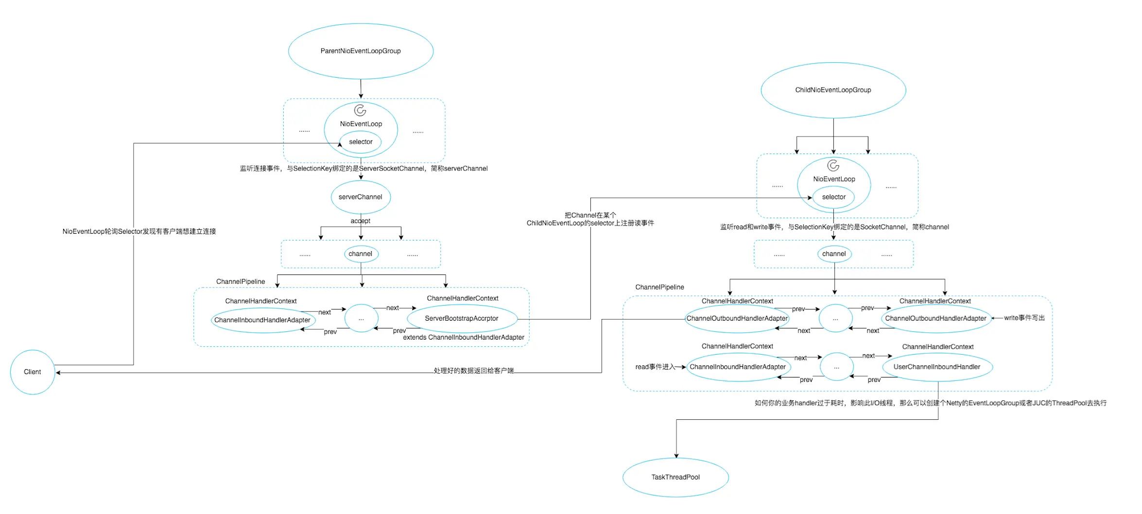 从Channel里读出来的数据,需要经过与Channel绑定的ChannelPipeline中的InboundHandler处理,再注册写事件。写出的时候需要经ChannelPipeline中的OutboundHandler处理在写回给客户端。
