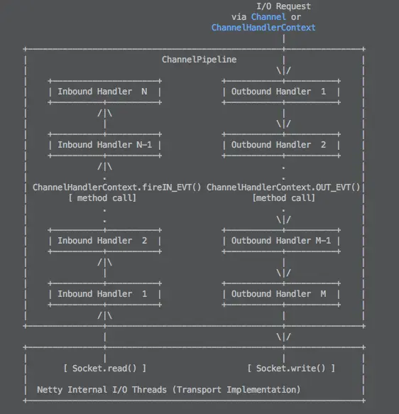 ChannelPipeline:文档中的解释是"it handles or intercepts inbound events and outbound operations of a implements an advanced form of the Intercepting Filter pattern",翻译过来就是它处理或者是拦截入栈事件和出栈的一些操作,实现了一种更加高级的拦截过滤器模式。过滤器模式是入出走同一个过滤器,而对于ChannelPipeline入栈处理和出栈处理分离开了,ChannelPipeline