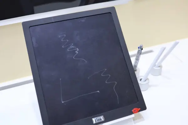 另外,现场还展示一项UHF免电池解决方案,为元太去年和富士通半导体开发的技术,可利用UHF频段为电子纸更新讯息,并且供应电力,不过,由于UHF频段易受到干扰,现场展示的发射器与电子纸无线传输、供电距离约20公分,可能使这项技术的应用场景受到一些限制。除了智能零售,电子纸也可被应用在智能交通、智能医疗上,例如打造智能公交车亭,以电子纸显示公路路线或到站动态,在智能医疗上,目前也有医院采用电子纸取代药盒上的贴纸标签,标示不同病人的姓名、给药信息,与元太合作的研华科技展示可透过1GHz以下频段及Hub,从后台管理系统就能为院内的电子纸药盒卷标、病床床头卡更新讯息。过去电子纸以显示为主,元太开发不需电子TFT背板、电子零组件的电子墨水薄膜E Ink JustWrite技术,只要以具磁性的笔就能在电子纸上手写文字或涂鸦,可取代传统黑板或白板,或是作为儿童的学习工具。手写笔只要使用具磁性的笔蕊,就能在E Ink JustWrite书写内容,元太强调耗电极低,按下右下角按键就能抹除手写的内容,可以重新书写新的内容,但抹除的过程约需1至2秒,等待抹除的时间略长些: