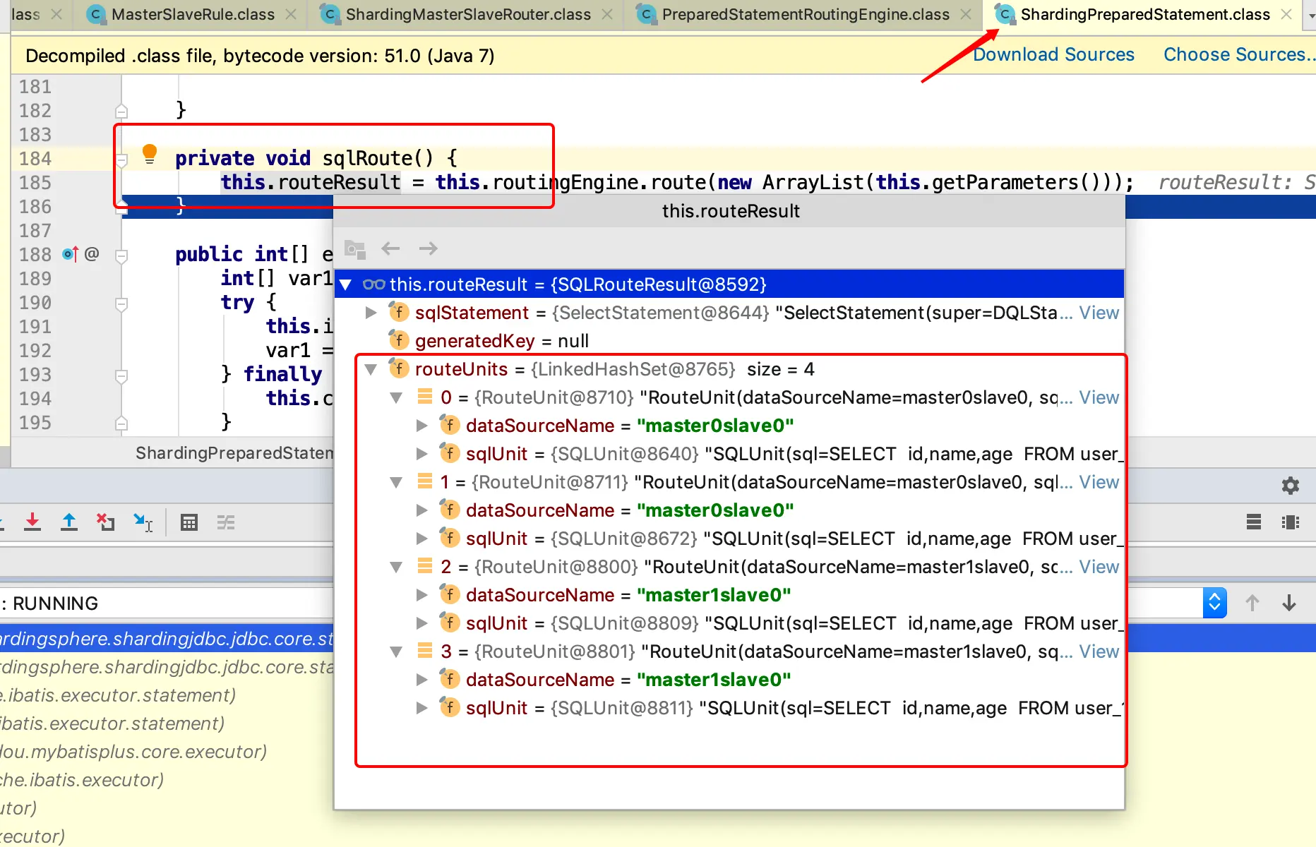 根据ShardingMasterSlaveRouter路由计算,得到sqlRouteResult.getRouteUnits()单元列表,然后将结果addAll添加并返回