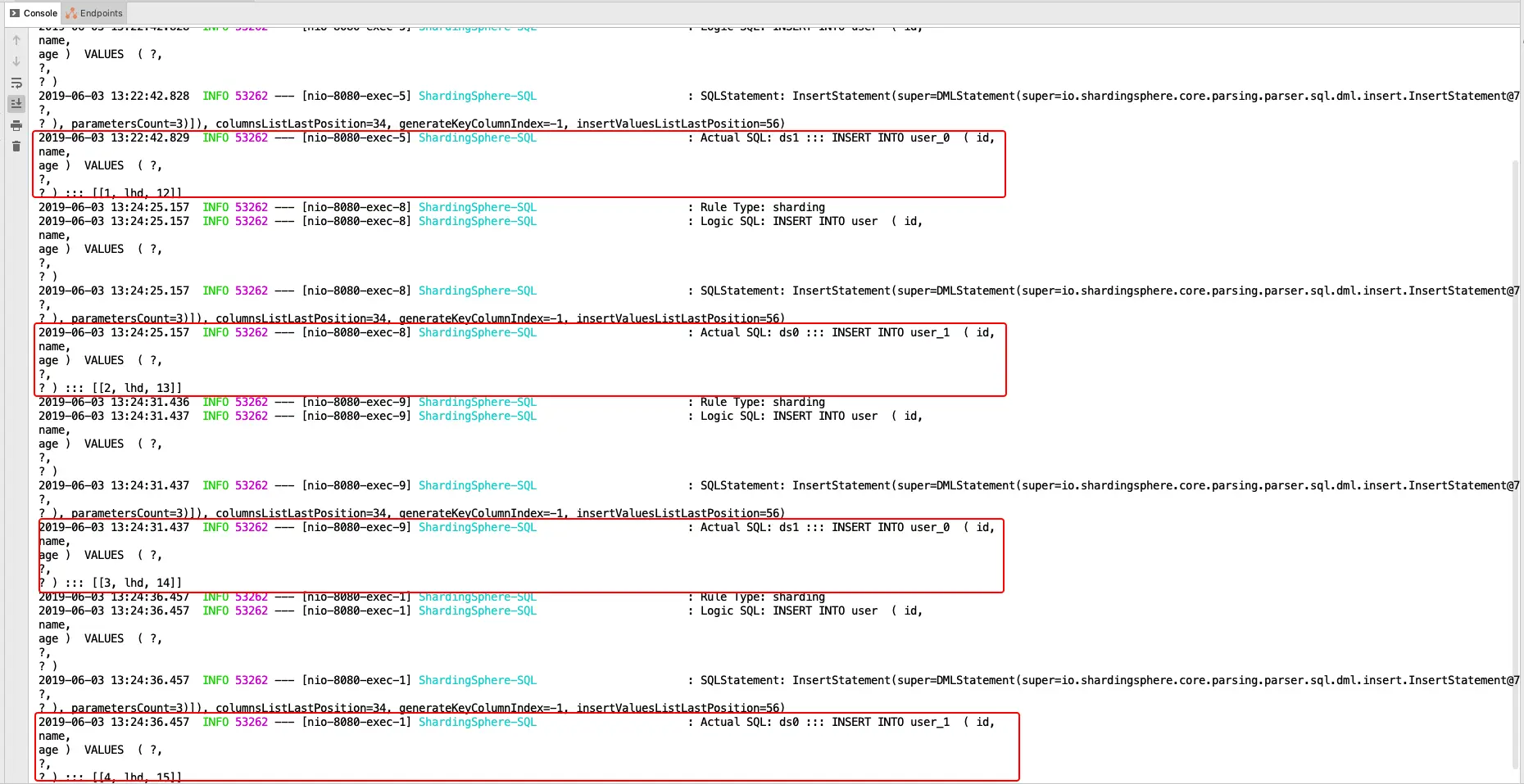 结果和之前的一样 根据分片算法和分片策略,不同的id以及age取模落入不同的库表 达到了分库分表
