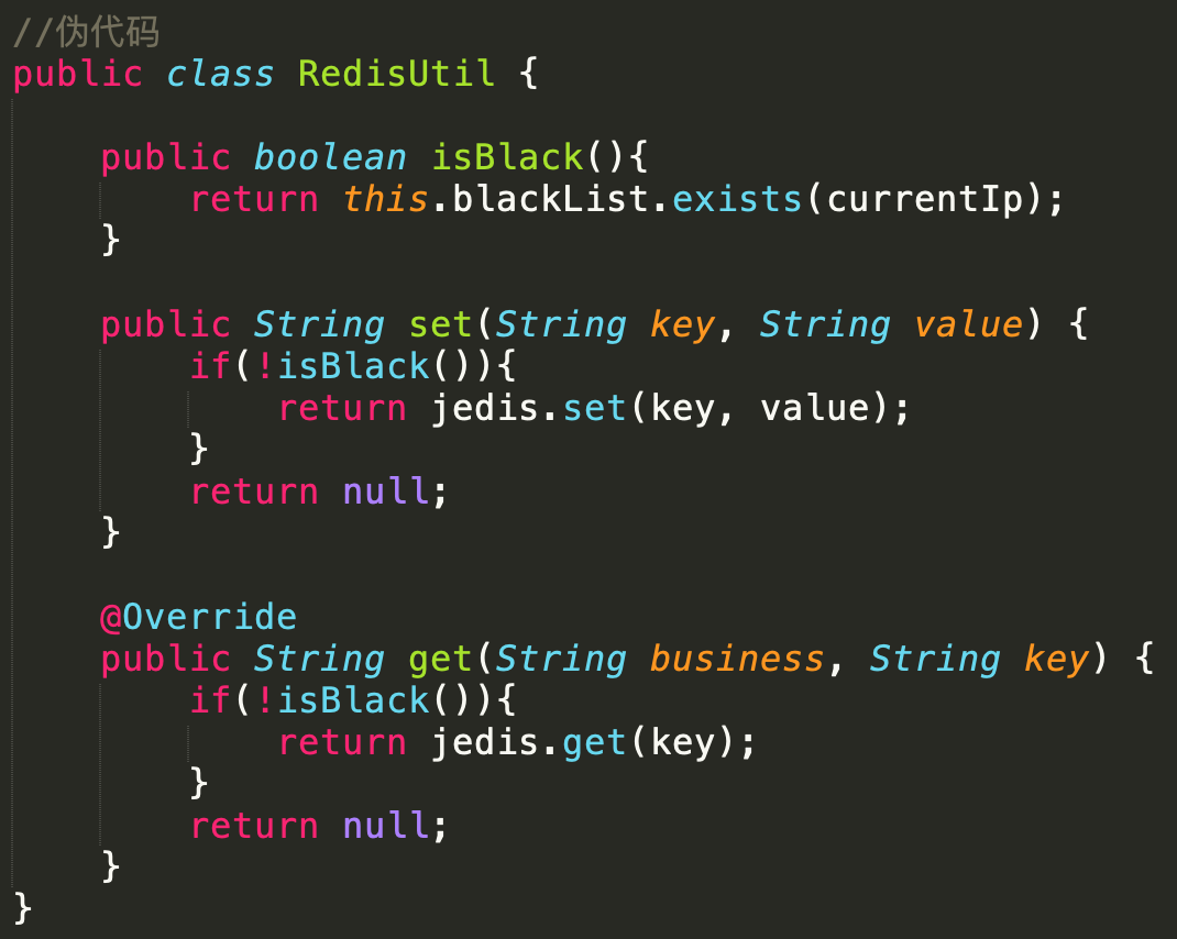 在上面的发现异常的基础上面,如果发现某些业务应用,不正常,就可以立即发起截断该客户端的请求,这样可以保证其他业务不受影响。这里我们使用客户端方式去实现截断。原理也很简单,在redis二次封装的类中,我们需要判断本机是否在黑名单中,如果存在,则无法操作方法,或报异常。