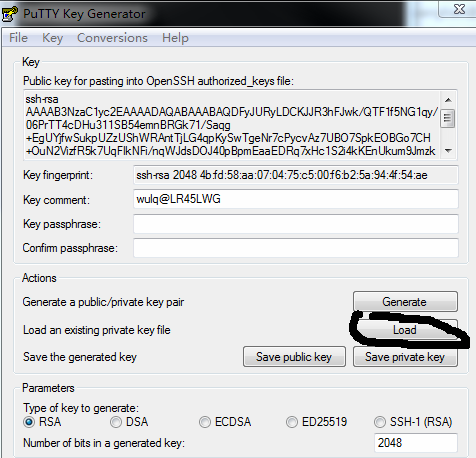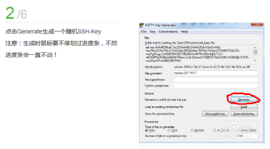 运行 PuTTY Key Generator Generate 一组密钥,注意鼠标要来回滑 动以使得可以生成 保存 私钥和公钥,记住位置。