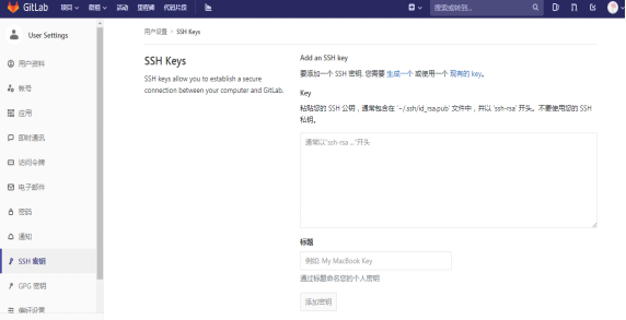 在gitlab服务器端web页面,个人设置里,添加SSH密钥 输入上面保存的 ssh-rsa开头的公钥字符