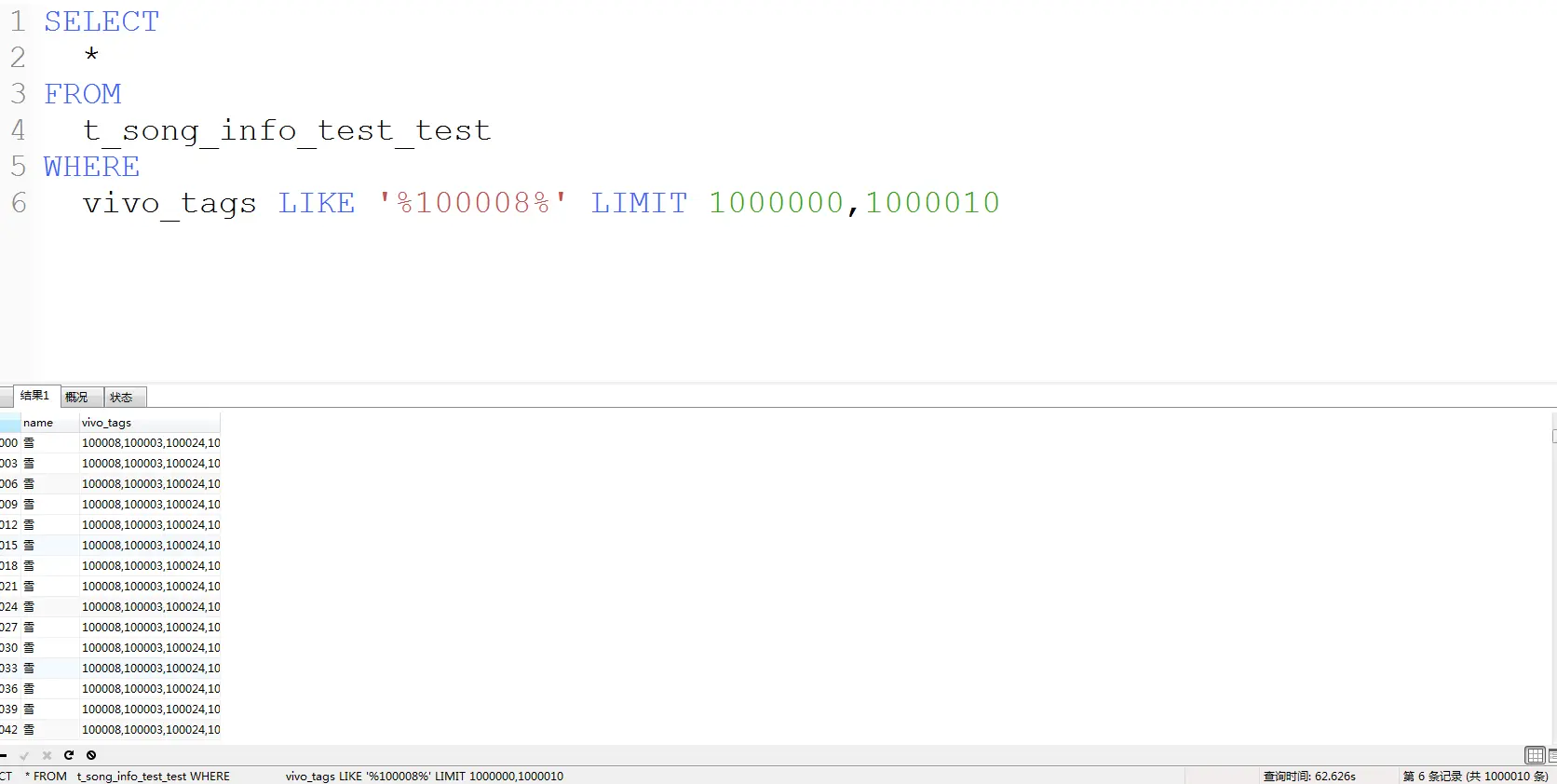 但是当查询第1000000到1000010条时,由于要扫描大约3百万条数据才能获得结果集,因此速度就非常慢了: