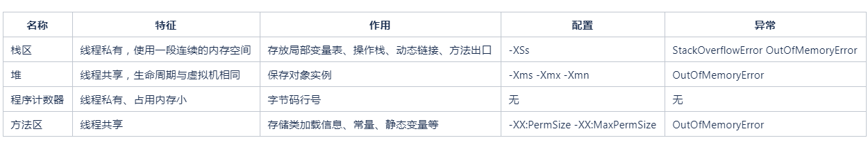 - Java.lang.OutOfMemoryError: PermGen space(JAVA8引入了Metaspace区域)方法区内存溢出,通常是因为加载的类过多,可以先排除程序问题导致的重复类加载,或者加大方法区内存的分配