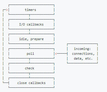 timers观察者中存放了定时器(setTimeout,setInterval)回调队列idle观察者中存放process.nextTick()回调队列poll观察者中存放了读取文件的回调队列check观察者中存放setImmediate回调队列