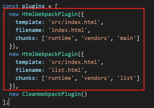 这样会生成两个html文件,用的模板都是index.html,第一个html叫index.html,chunks代表需要引入的js文件,分别是runtime.js,vendors.js,main.js。另一个list.html,引入的js分别为runtime.js,vendors.js,list.js。
