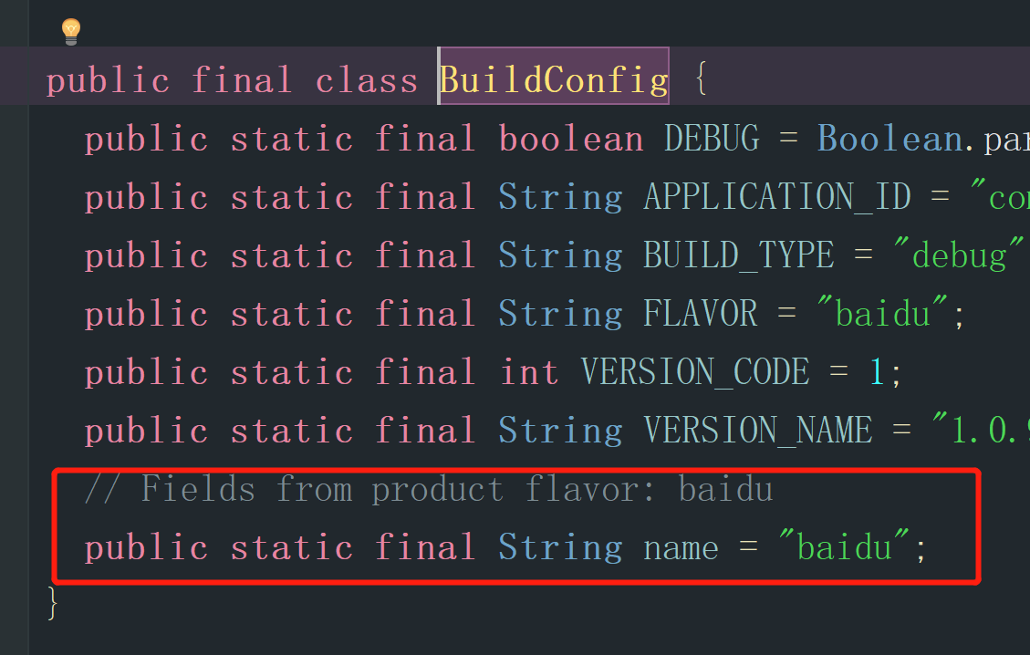 buildConfigField 'String','name','"baidu"'
