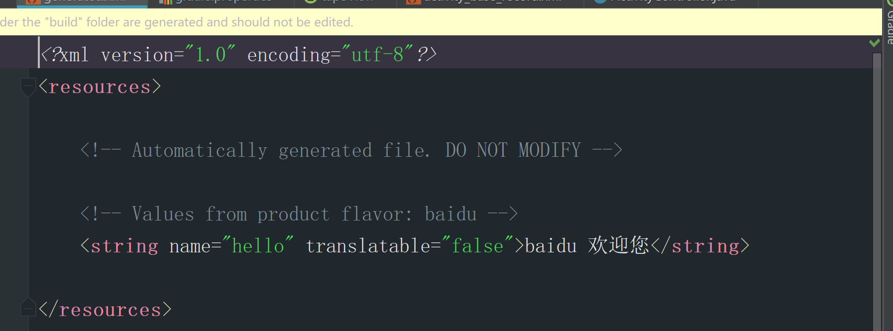 Android gradle提供了resValue(String type,String name,String value)来 添加资源。只能在productFlavors或buildTypes中使用