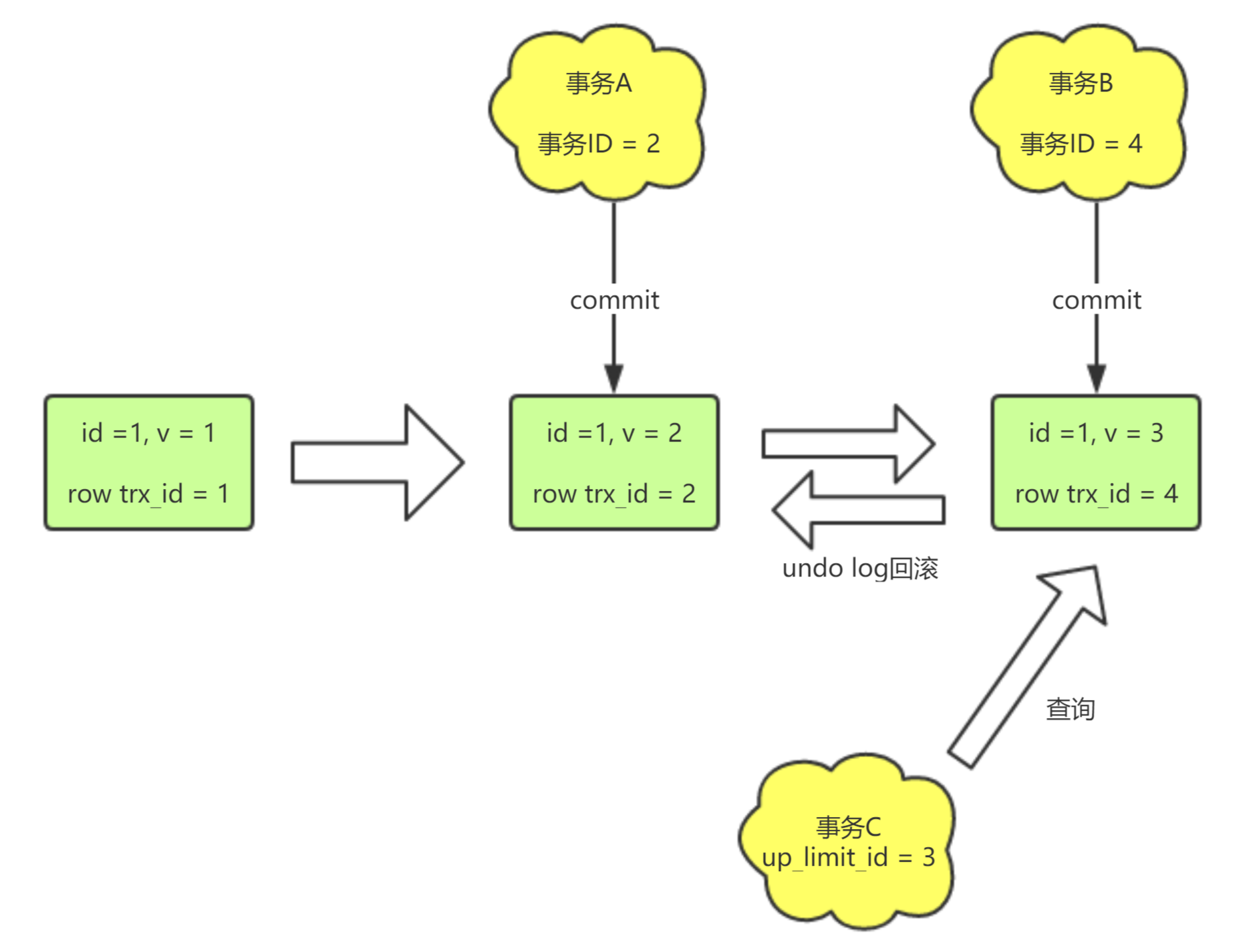 此时,有一个事务C对id = 1的这行执行读操作,事务C的up_limit_id = 3,那么该事务读到的数据版本就应该是row trx_id = 2, v = 2