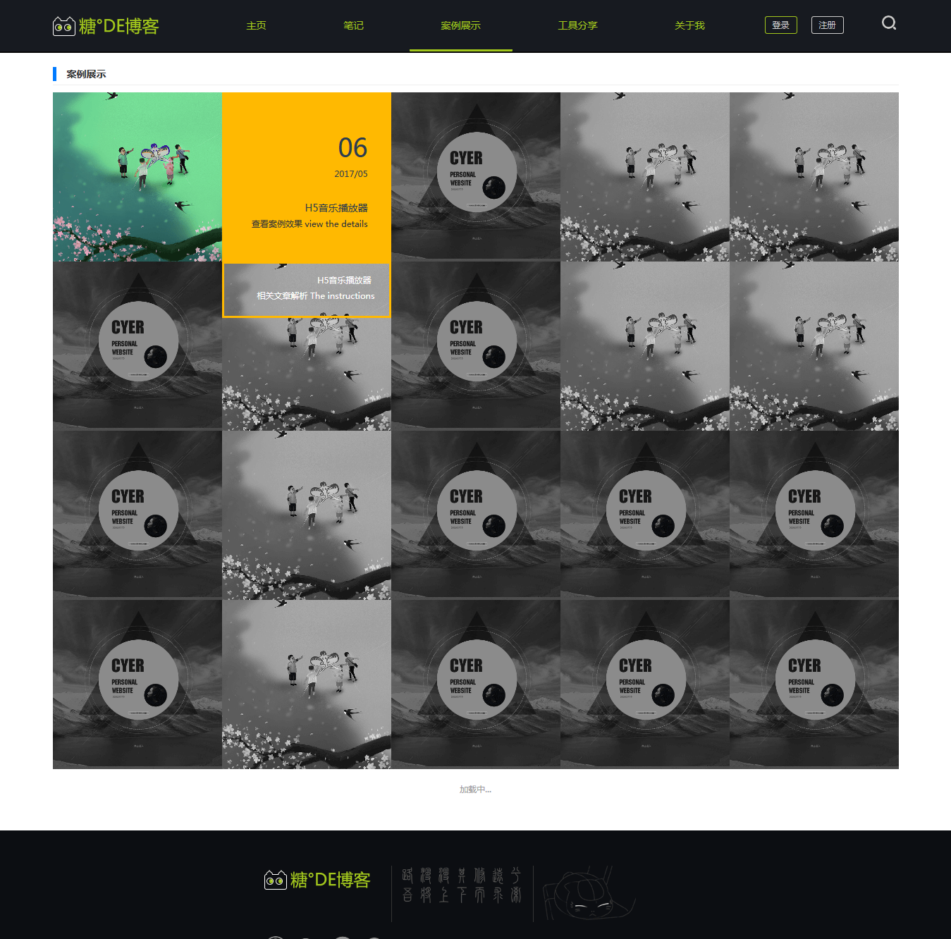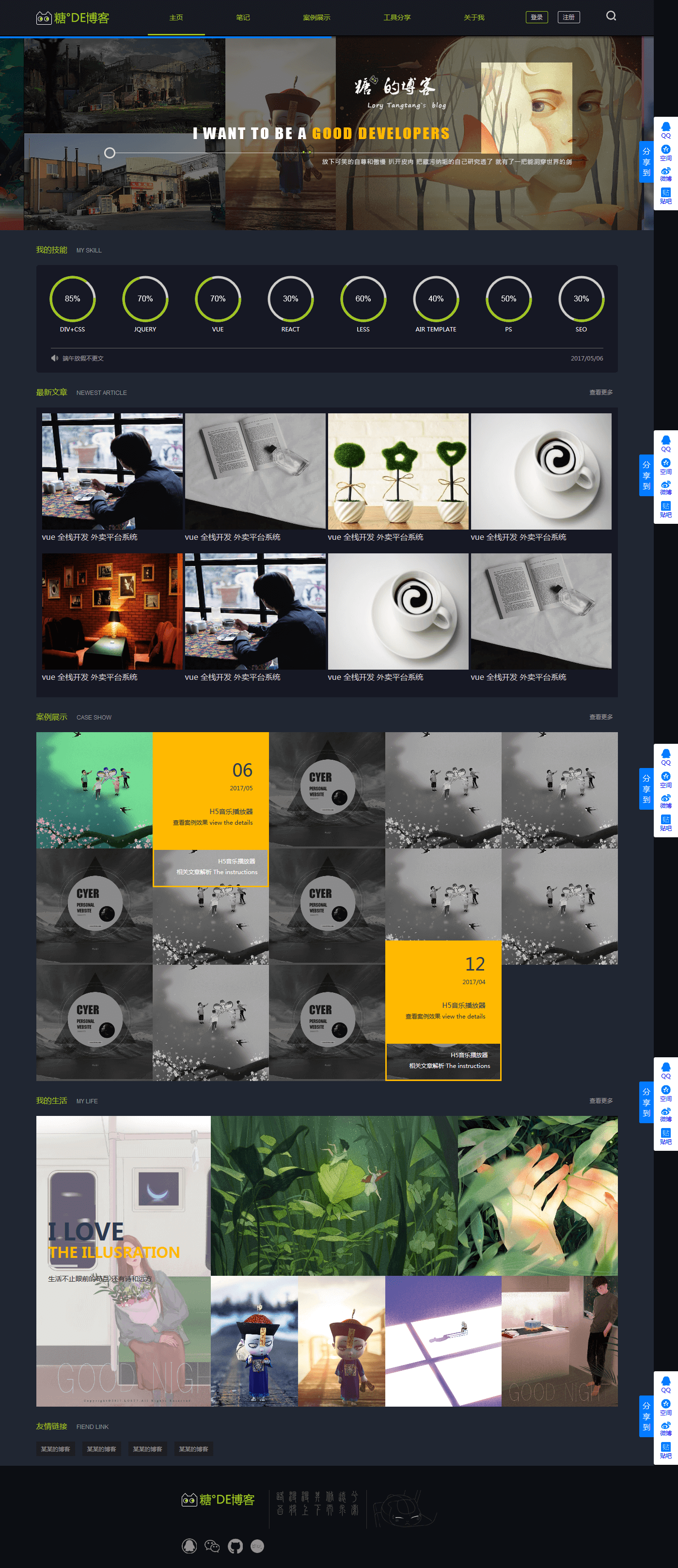 - 1)首页(包含导航、轮播、技能水平、最新文章、案例、个人爱好)。 更多文章Btn=>文章列表,文章阅读详细=>文章阅读页。 更多案例Btn=>案例展示列表页,相关案例展示=>案例展示页(子站 未写),相关文章解析=>对应解析文章阅读页