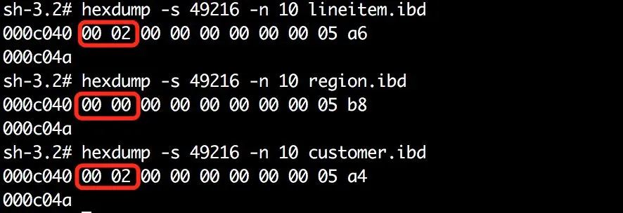 接下来我们用 hexdump 工具,查看表空间文件指定偏移量上的数据:
