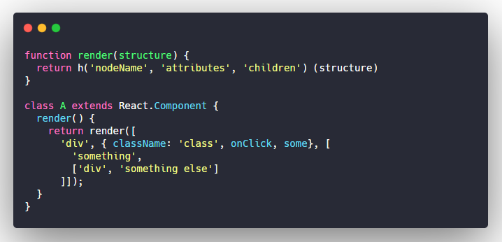 第一个问题是它非常冗长。就像真人一样很啰嗦,这里的主要罪犯是React.createElement。因此,第一个解决方案是把它保存到一个变量,通常命名为h,类似hyperscript。这将为您节省大量文本,并使其更具可读性。为了说明这一点,让我们重写一下过去的例子: