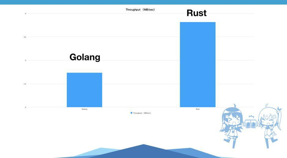 然后我们对比来了一下 Golang 和 Rust。虽然这两门语言完全不一样,一个是带 GC 的语言,一个是静态语言。Golang 语言比较简洁,没有泛型,没有枚举,也没有宏。其实关于性能也没什么可比性,一个带 GC 的语言的怎么能跟一个静态语言做对比呢?Rust 性能特别好。