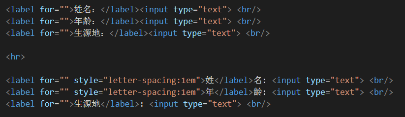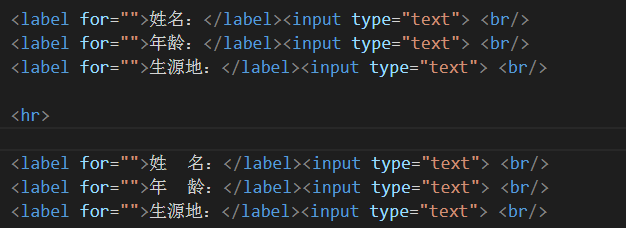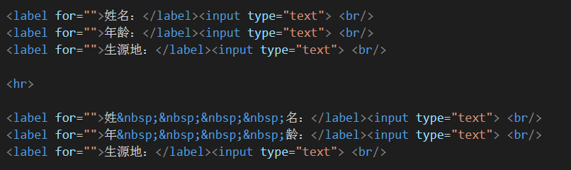 聪明的宝宝很快就可以看出来,由于label标签中的文字个数不一样,导致后面的input框不能对齐,这样就显得极其难看 。那有什么解决办法呢???回答是肯定的。那我一开始是这样想的的:我在姓名和年龄的中间加空格就好了呀,让名和龄与地对齐~