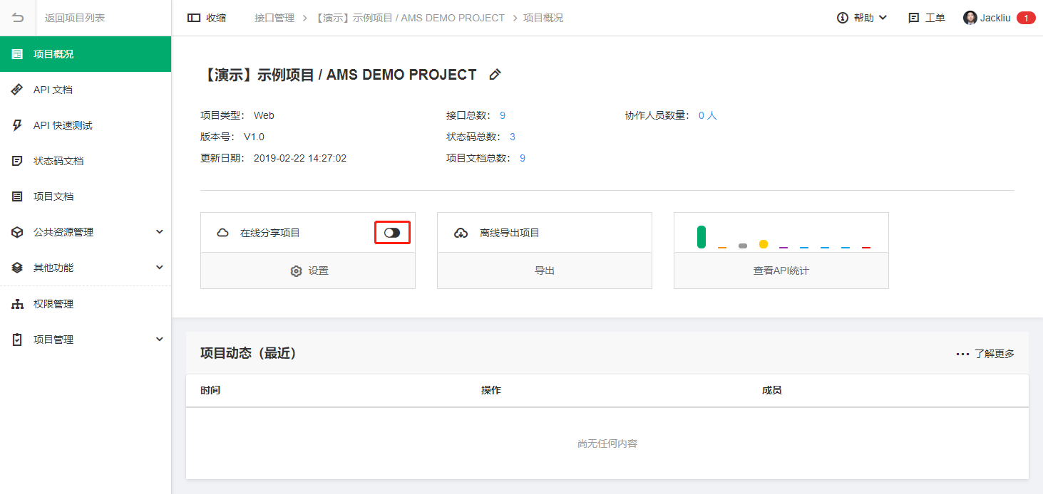5. 可以直接在项目概况页开启和关闭项目分享