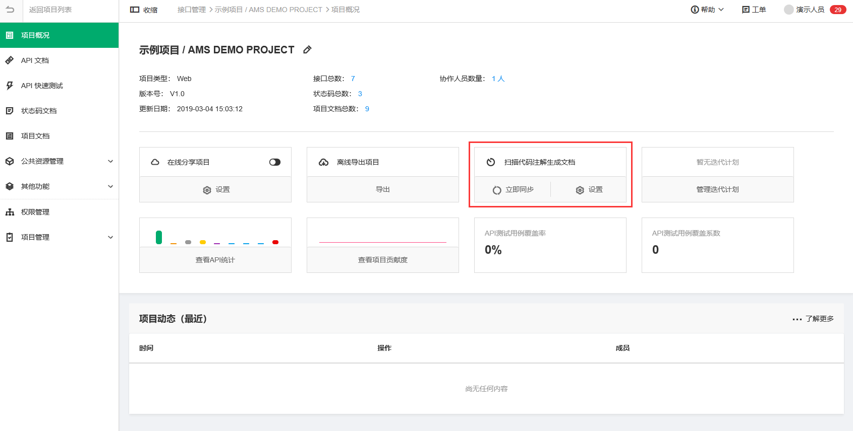 7.支持读取 gitlab 的 Java/php 代码注解生成 API 文档 在项目概况页加入“扫描代码注解生成文档”板块,支持读取 gitlab 的 Java/php 代码注释生成 API 文档。设置相关信息后点击“立即同步”,可以自动读取代码注释生成 API 文档。