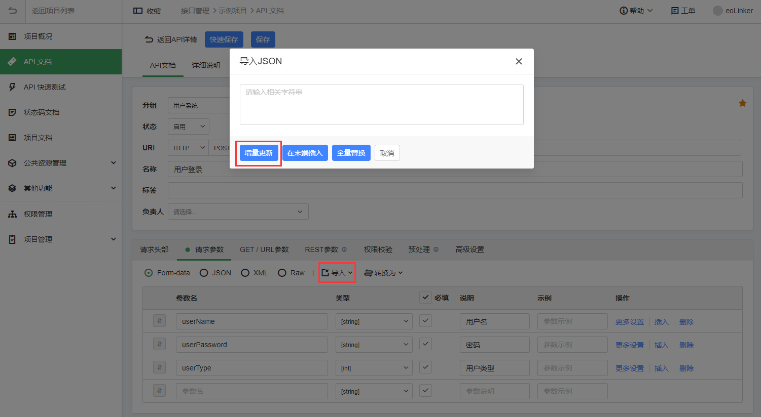9.导入Json、XML数据支持增量更新 如果导入的数据中有注释,将会自动识别注释,将注释填写到说明中,识别发现数据注释和文档说明一样时,将自动跳过注释。之前界面中的“插入”改为“在末端插入”,将“替换”改为“全量替换”。