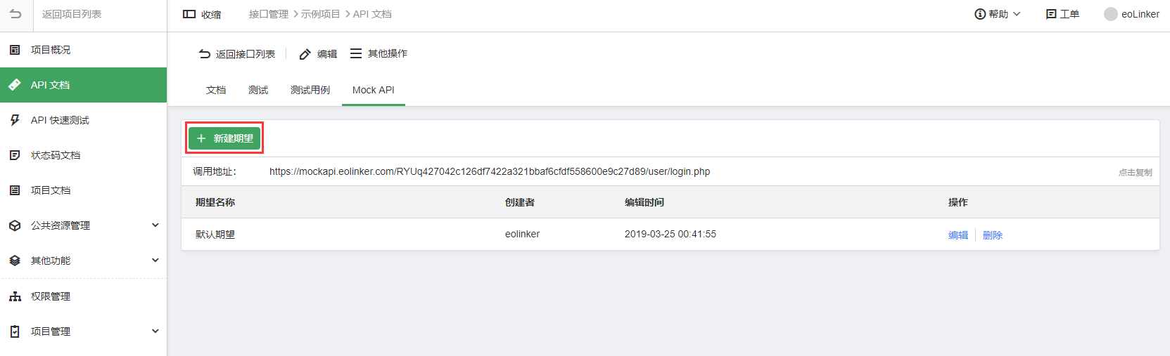 11.支持自定义Mock API期望,可以根据不同的请求参数返回不同的相应数据 Mock API 成为独立功能,不再依赖于 API 文档中填写的返回参数。进入 API 详情页,点击"新建期望"按钮会弹窗创建 Mock API 的信息,原先已填写的 MOCK 数据,将会自动转为默认期望,如下图所示: