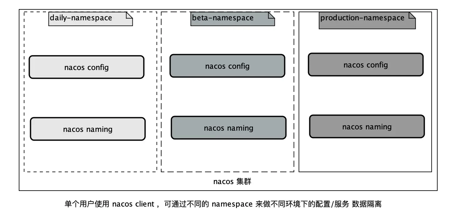 - 从一个租户(用户)的角度来看,如果有多套不同的环境,那么这个时候可以根据指定的环境来创建不同的 namespce,以此来实现多环境的隔离。例如,你可能有日常,预发和生产三个不同的环境,那么使用一套 nacos 集群可以分别建以下三个不同的 namespace。如下图所示: