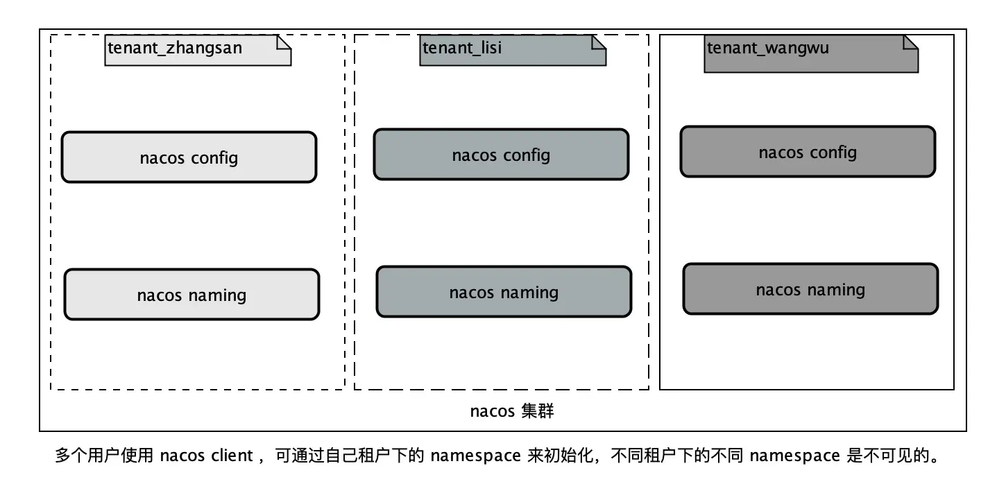 - 从多个租户(用户)的角度来看,每个租户(用户)可能会有自己的 namespace,每个租户(用户)的配置数据以及注册的服务数据都会归属到自己的 namespace 下,以此来实现多租户间的数据隔离。例如超级管理员分配了三个租户,分别为张三、李四和王五。分配好了之后,各租户用自己的账户名和密码登录后,创建自己的命名空间。如下图所示。