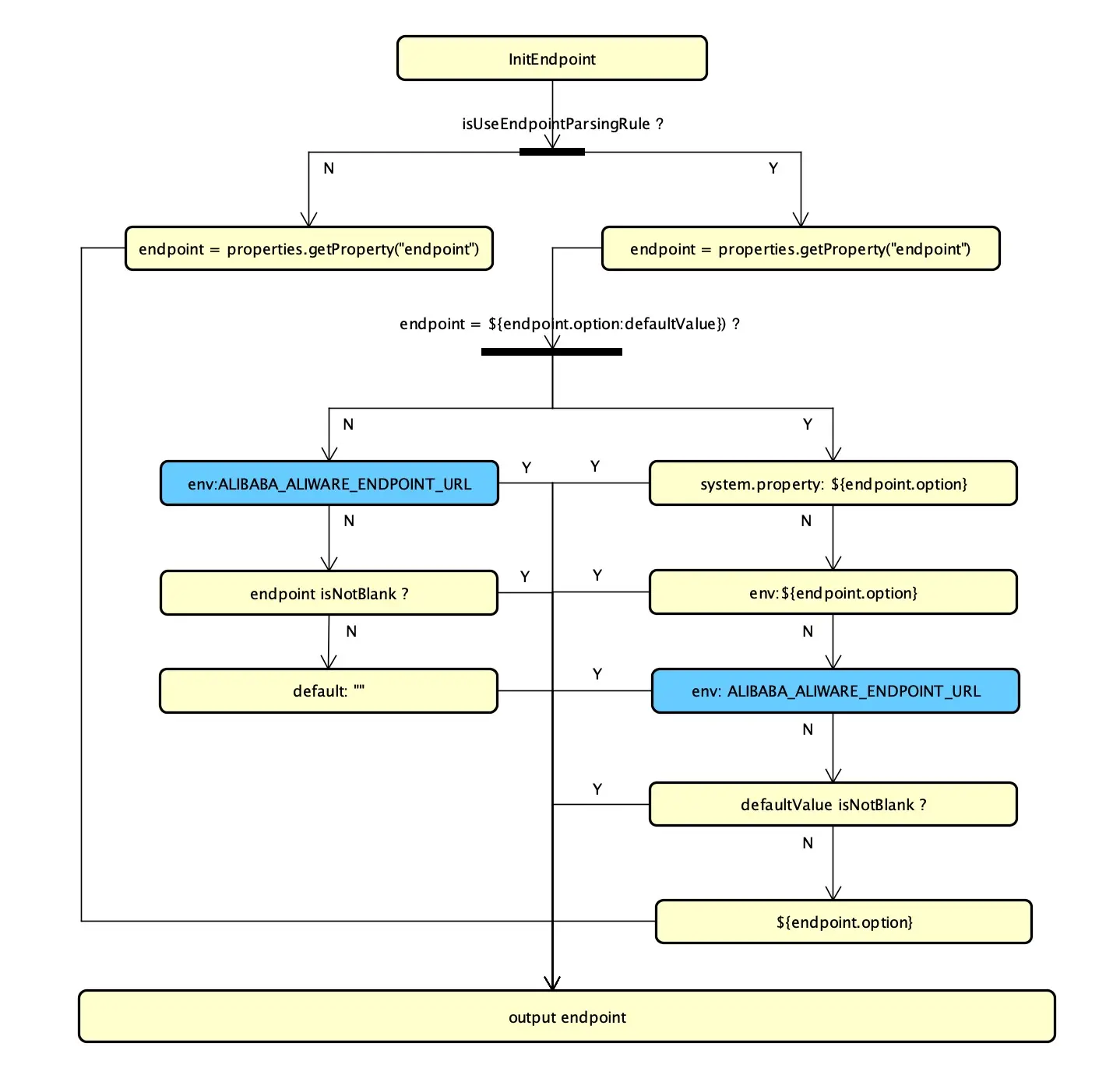 注意: 蓝色特别区分的是支持云环境下(阿里云上的 EDAS)自动从系统环境变量中来读取 endpoint 值,以此来达到用户本地开发或者将应用往云上迁移的时候以零成本的改造方式实现平滑上云。