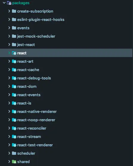 react工程根目录下有packages文件夹,其间放置的是react的各个包,我们暂时把着力点放于react目录下。内部是react源码实现。