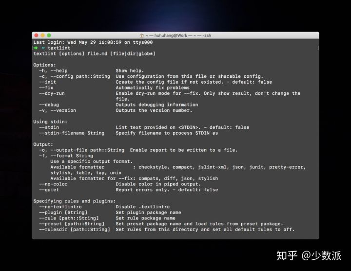 安装完成之后,重新打开终端或 PowerShell,键入 textlint 命令看是否能成功调用。如果出现了如下图所示的参数说明,则代表 textlint 已正确安装。