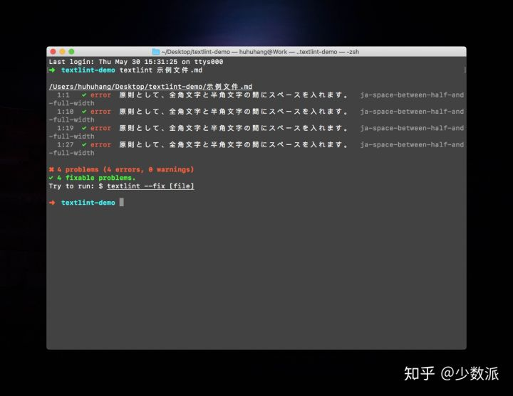 接下来,只需要执行 textlint . 命令,即可实现对该目录及子目录下任意文本文件的格式检查。当然,你可以特别指定一个文件 textlint 示例文件.md 或者进行模糊匹配检查 textlint 示例*。
