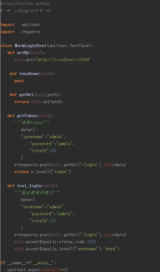 到这里,我们使用python编写一个接口测试用例,来验证换这个登录的接口和获取它的token,见实现的代码: