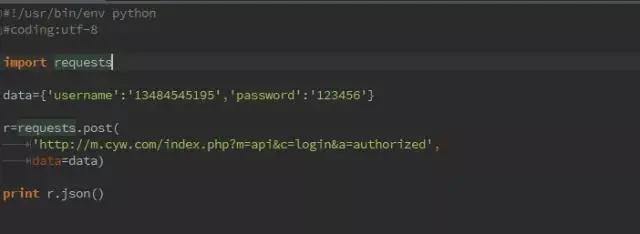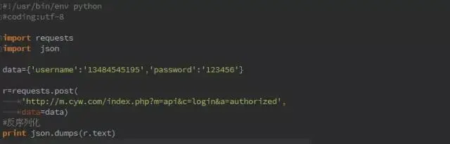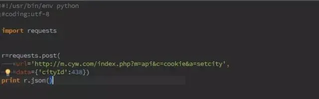 我们可以看到,在POST请求中,参数是URL,data,json以及字典,data其实就是以表单形式的数据,或者说我们只需要把一个字典给data作为参数来传递,来看这样的一个请求,请求的URL为:http://m.cyw.com/index.php?m=api&c=cookie&a=setcity,参数是城市的ID,然后返回这个城市,来看这样的一个POST请求,见实现的代码: