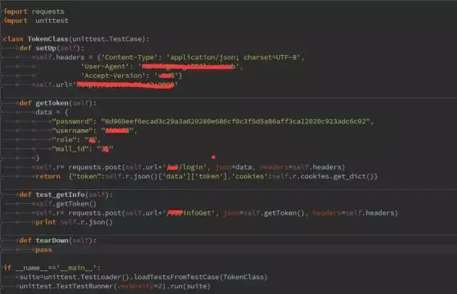 事实上,在一个post请求中,这是一个简单的请求,在工作的时候,很多时候是登录成功后,返回一个token,然后后面的每一个请求都带这个参数token去请求,也就是说,在接口自动化测试中,首先要做的就是登录获取token这个参数,下来后面的请求把获取的这个参数token带上去请求或者操作系统的其他业务,下面来看实现这样的一个过程代码,实现的思路把登录写成一个方法,然后把token返回,再做下一个请求的时候,把token当作参数来传递,具体实现见如下的代码: