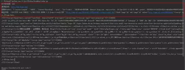 注释:如上的代码部分被红色的掩盖,希望理解,再如上的代码中,我们可以看到,登录成功后,返回了token,然后在执行其他接口的时候,直接把返回的token当作是参数来处理,但是有一点是必须得注意的,必须先登录,再执行登录后的接口,要不会提示错误的。使用requests发送一个请求后,我们可以获取这个请求的响应内容,HTTP的状态码,以及URL,我们来看这样的一个过程,比如请求bing,我们获取text,stats_code,url和headers,见实现的代码: