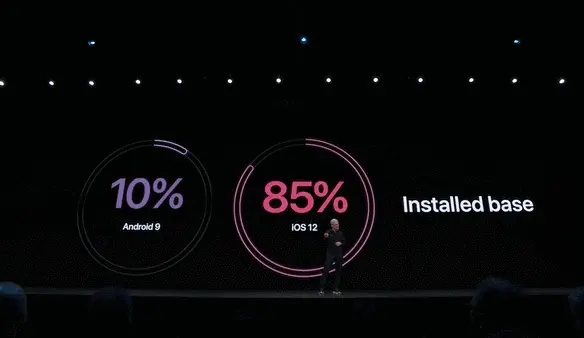 库克先炫耀了一波iOS 12的安装率85%和满意率97%,也顺势少不了嘲讽一波安卓,毕竟最新的安卓9只有10%的安装率。