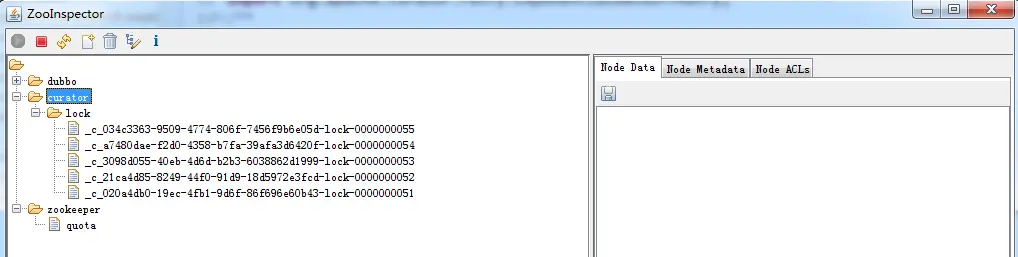 }这里我们开启5个线程,每个线程获取锁的最大等待时间为5秒,为了模拟具体业务场景,方法中设置4秒等待时间。开始执行main方法,通过ZooInspector或者zk-ui 可视化监控/curator/lock下的节点如下图: