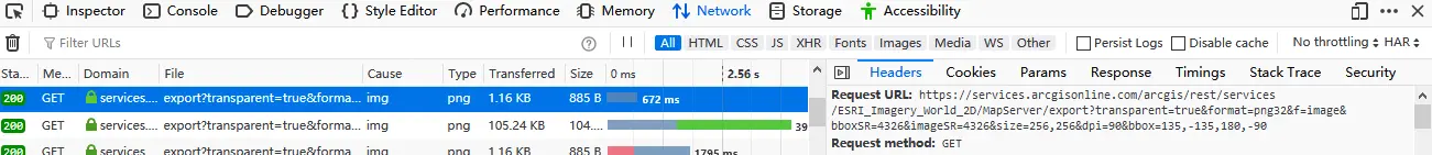 发现 URL 参数是由 dpi 、bboxSR、imageSR、size、transparent、format、f 、bbox 几个参数构成。多分析几条 URL 数据会发现,URL 参数中 dpi 、bboxSR、imageSR、size、transparent、format、f 这几个参数是固定不变的。只有 bbox 在变动。那么,如果我们手动计算 bbox 并拼接参数,是不是就可以实现加载 ArcGIS 瓦片图层了。