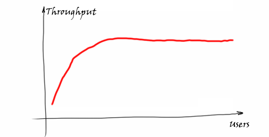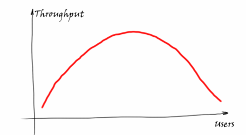 而DB的访问大到一定程度时,DB的吞吐量也会出现下降,并且会越来越差,如下图所示: