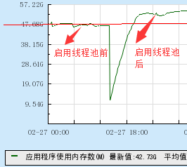 DB启用线程池后,内存飙升了8G左右,如下图:
