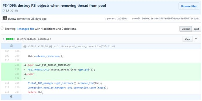 备注:目前Percona server 5.7.21-20版本已经修复了线程池和PS同时打开内存泄漏的问题,从我测试的情况来看问题也得到了解决,大家可以直接使用Percona server 5.7.21-20的版本,如下图。