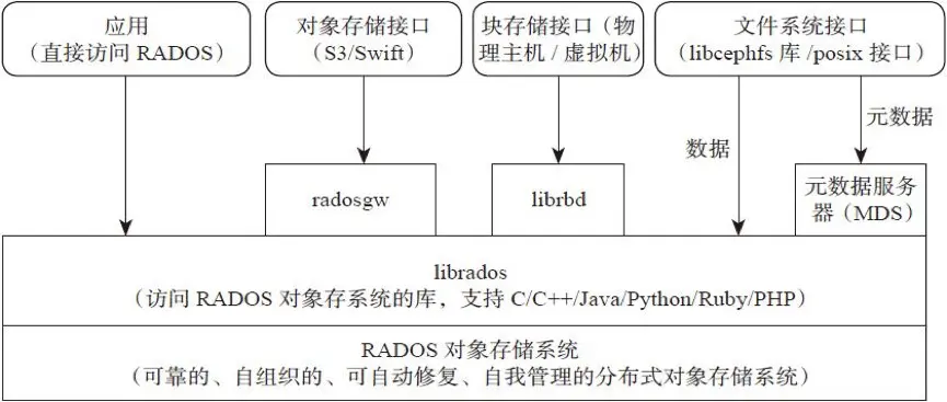 Librados 是 Rados 提供库,因为 RADOS 是协议很难直接访问,因此上层的 RBD、RGW 和 CephFS 都是通过 librados 访问的,目前提供 PHP、Ruby、Java、Python、C和C++支持。