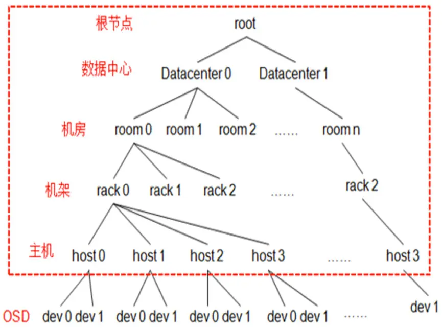 叶子节点是 device(也就是 osd),其他的节点称为 bucket 节点,这些 bucket 都是虚构的节点,可以根据物理结构进行抽象,当然树形结构只有一个最终的根节点称之为 root 节点,中间虚拟的 bucket 节点可以是数据中心抽象、机房抽象、机架抽象、主机抽象等。