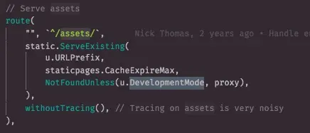 假设我们得请求相对 URL 为 /assets/locale/zh_CN/app-3396bd500e53f89d971d8c31ba7275f1c9ae2899062d4a7aeef14339084f44bd.js ,因为带有 assets 前缀,所以 workhorse 将采用处理静态资源文件的方式处理请求,如代码所示