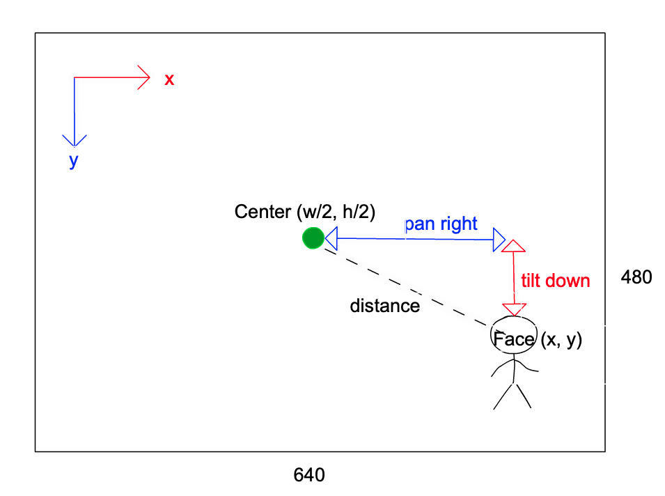 如何让机器人头部摄像头跟随识别到人脸位置变化而转动?一帧图像是 2 维的,人脸位置用坐标 (x,y) 表示,要实现跟踪人脸则需要两个轴 pan, tilt